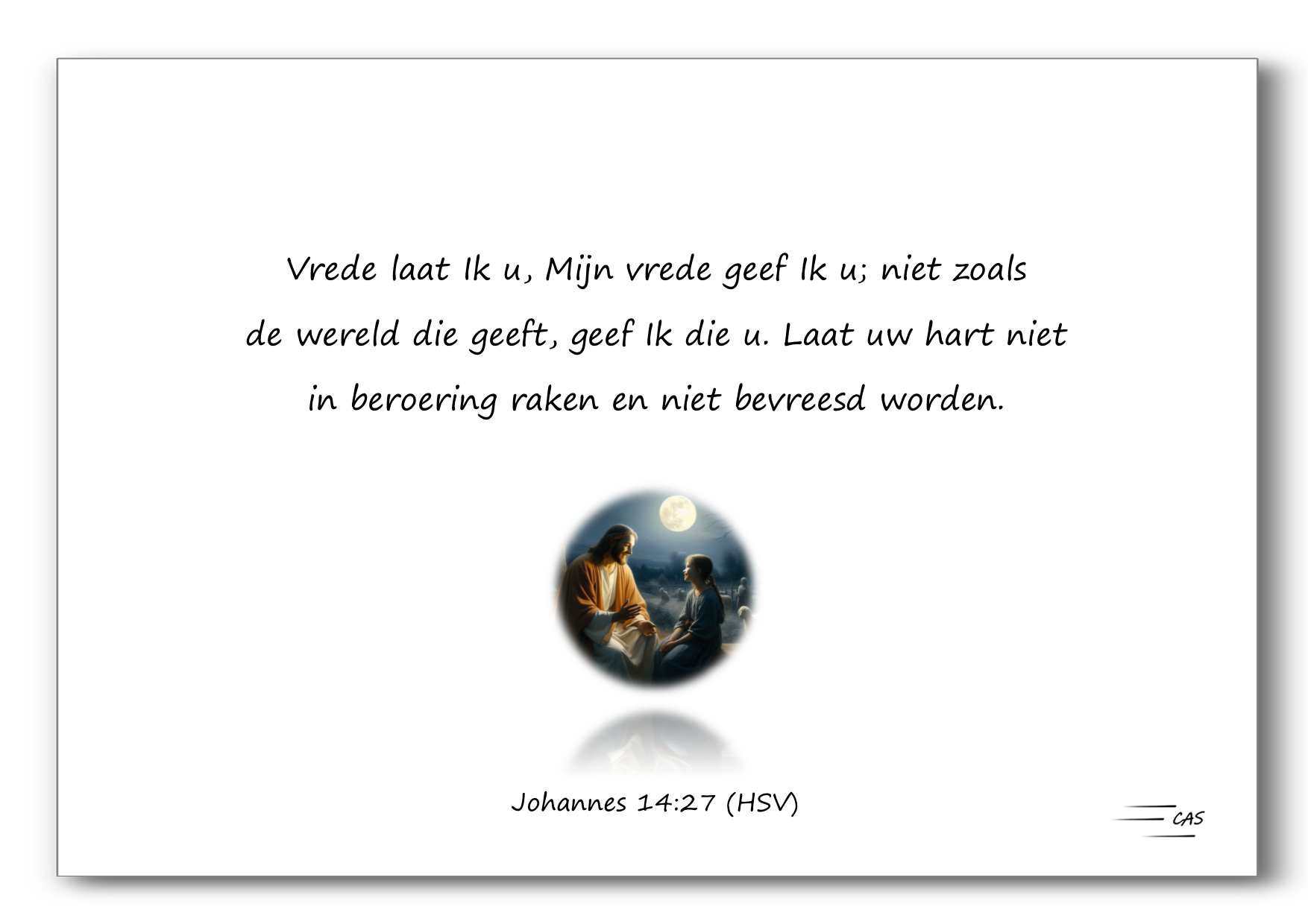 8) Vrede laat Ik u, Mijn vrede geef Ik u; niet zoals de wereld die geeft, geef Ik die u. Laat uw hart niet in beroering raken en niet bevreesd worden. - Johannes 14:27 (HSV)
