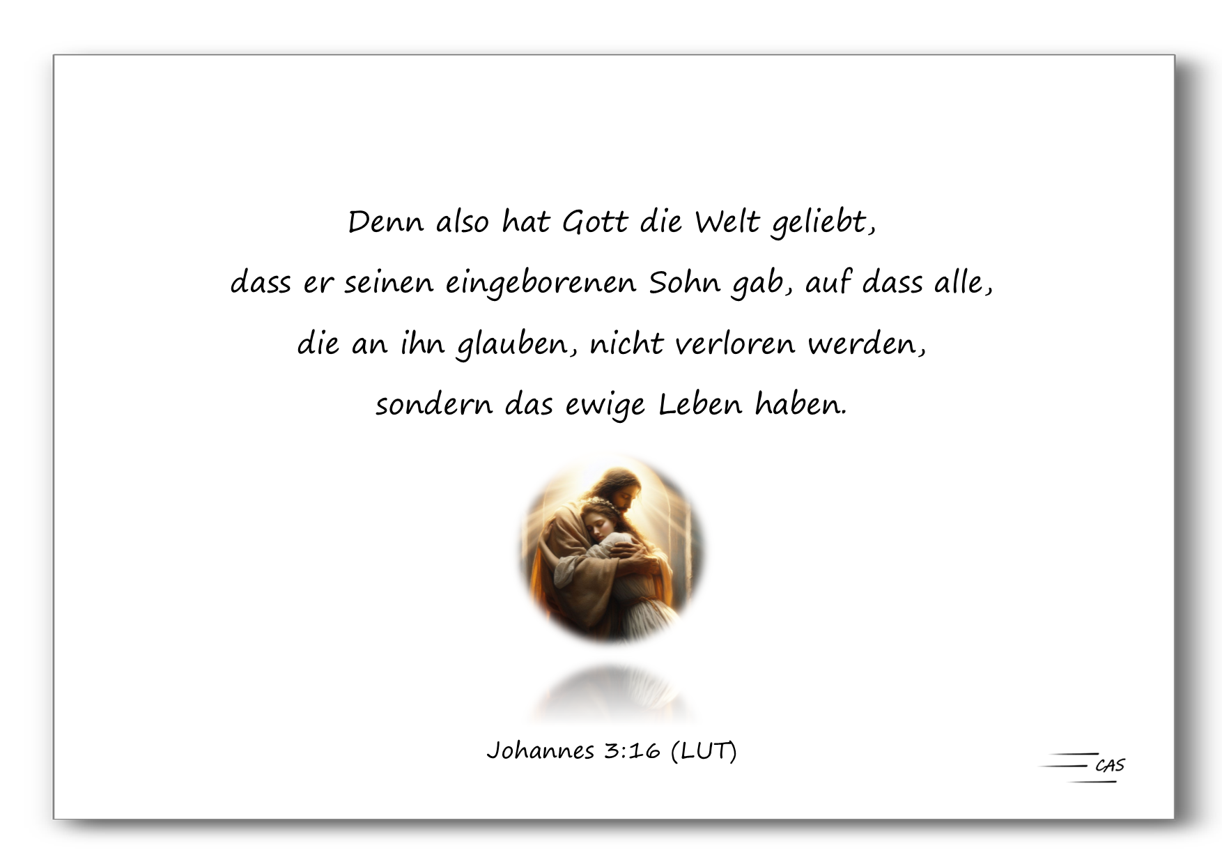 1) Denn also hat Gott die Welt geliebt, dass er seinen eingeborenen Sohn gab, auf dass alle, die an ihn glauben, nicht verloren werden, sondern das ewige Leben haben. - Johannes 3:16 (LUT)