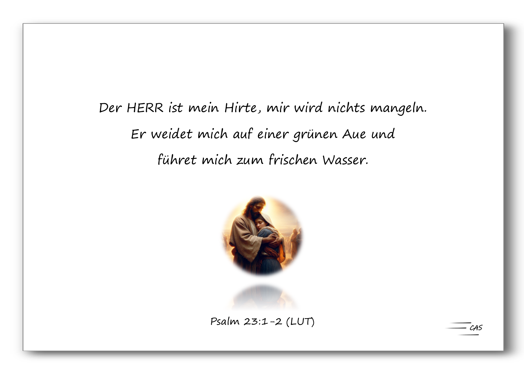 6) Der HERR ist mein Hirte, mir wird nichts mangeln. Er weidet mich auf einer grünen Aue und führet mich zum frischen Wasser. - Psalm 23:1-2 (LUT)