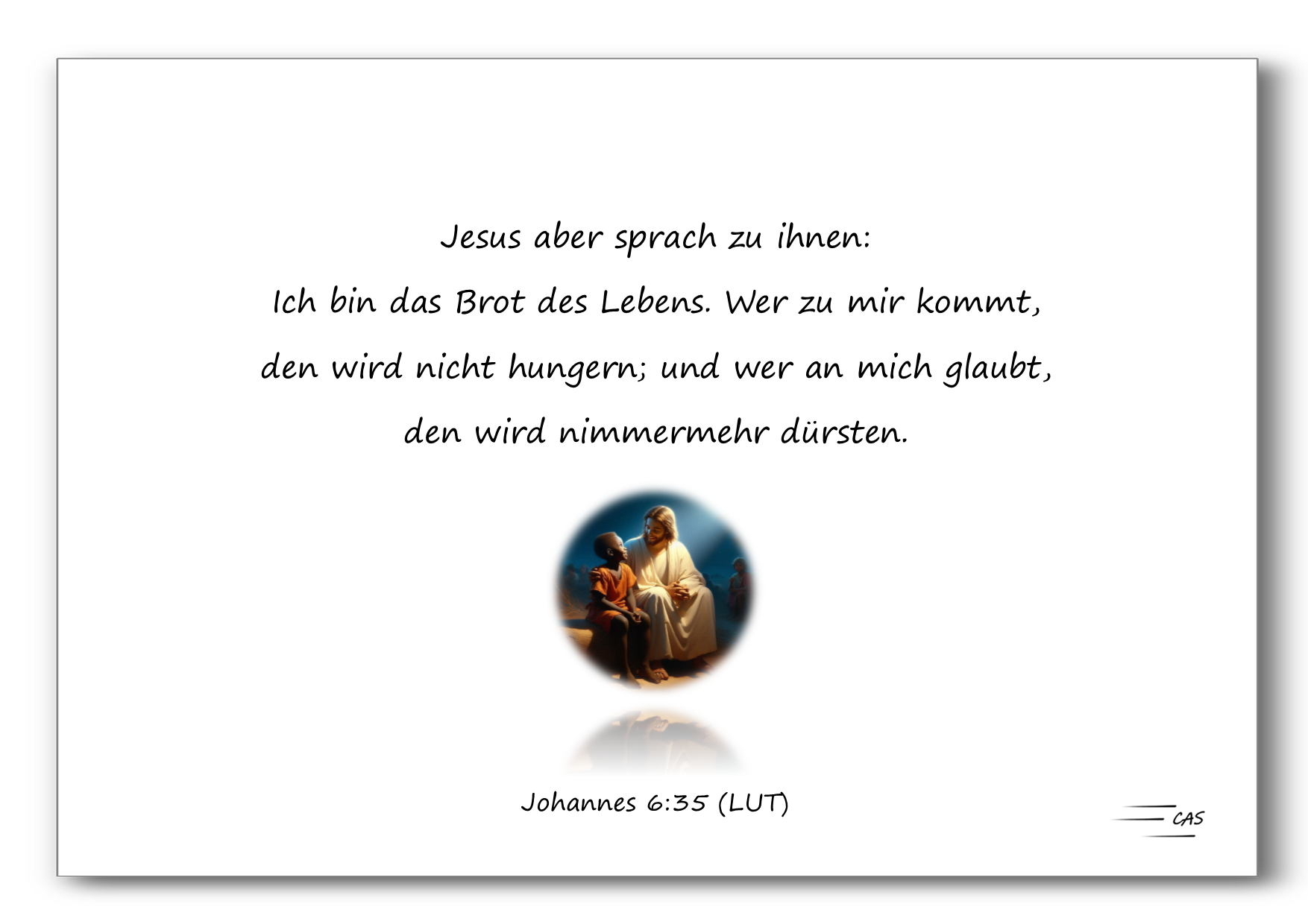 7) Jesus aber sprach zu ihnen: Ich bin das Brot des Lebens. Wer zu mir kommt, den wird nicht hungern; und wer an mich glaubt, den wird nimmermehr dürsten. - Johannes 6:35 (LUT)